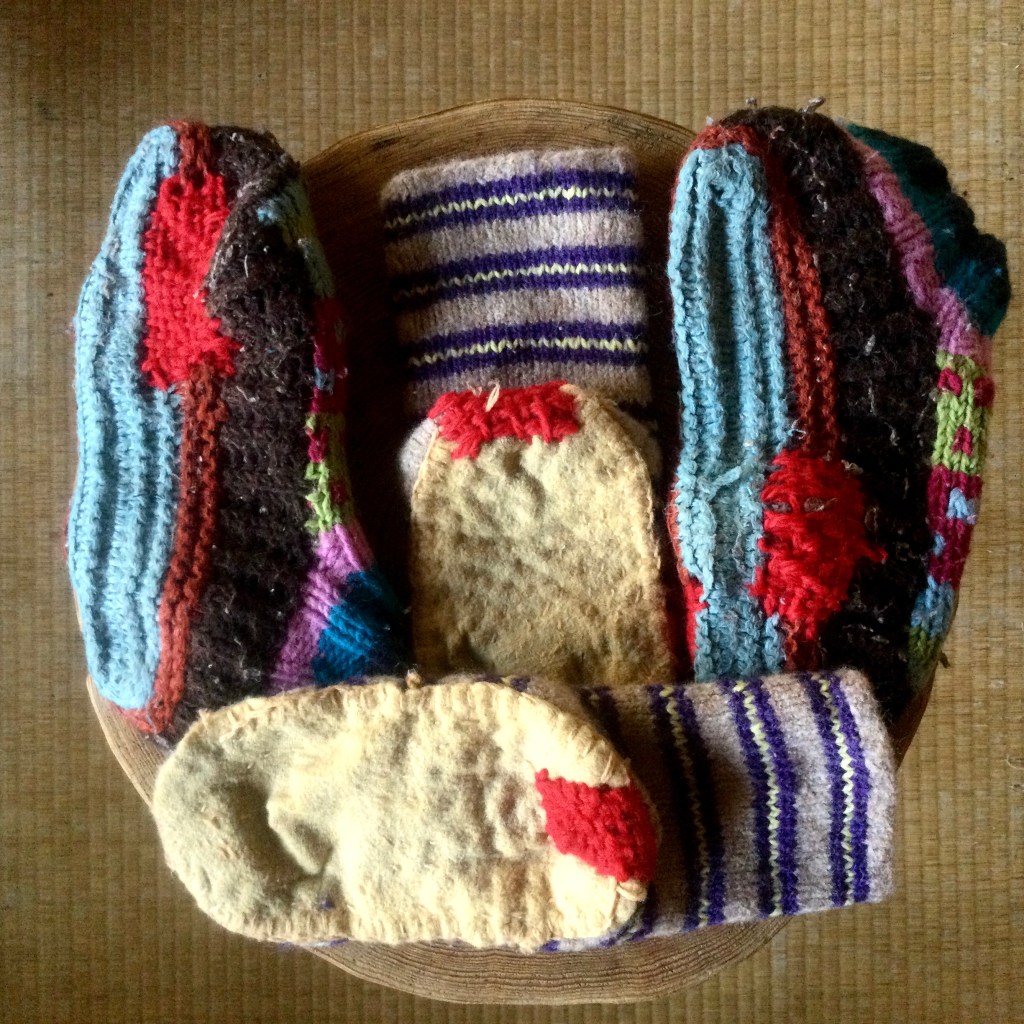 暖か素材のウールもカシミヤもパシュミナもヤクも大好きなんだけど、薪を運んだり廃材の釘に引っかけたりと、いつのまにか穴あきは日常。靴下も毛糸はやっぱり穴が開きやすいんだけどあったかいから大事。今年のお仕事終えて、洗って繕ってまた来年。赤いところ穴あきだったので、繕いました。ダーニングとゆう言葉が流行ってくれてありがたい。私の着る物、持つ物 もっているものほとんど繕ってるからね。ただのツギハギが好きなだけなんだけど。