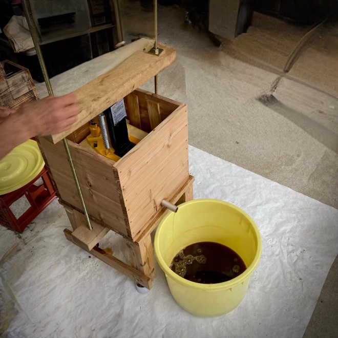 すでに夫妻は自宅分の作業を終えていたので準備も着実に段取りよくしてくれて 更には搾り器の改善点なども話し合い お互いすでに来年用に仕込んだ醤油搾りの次回に向けて期待を馳せた