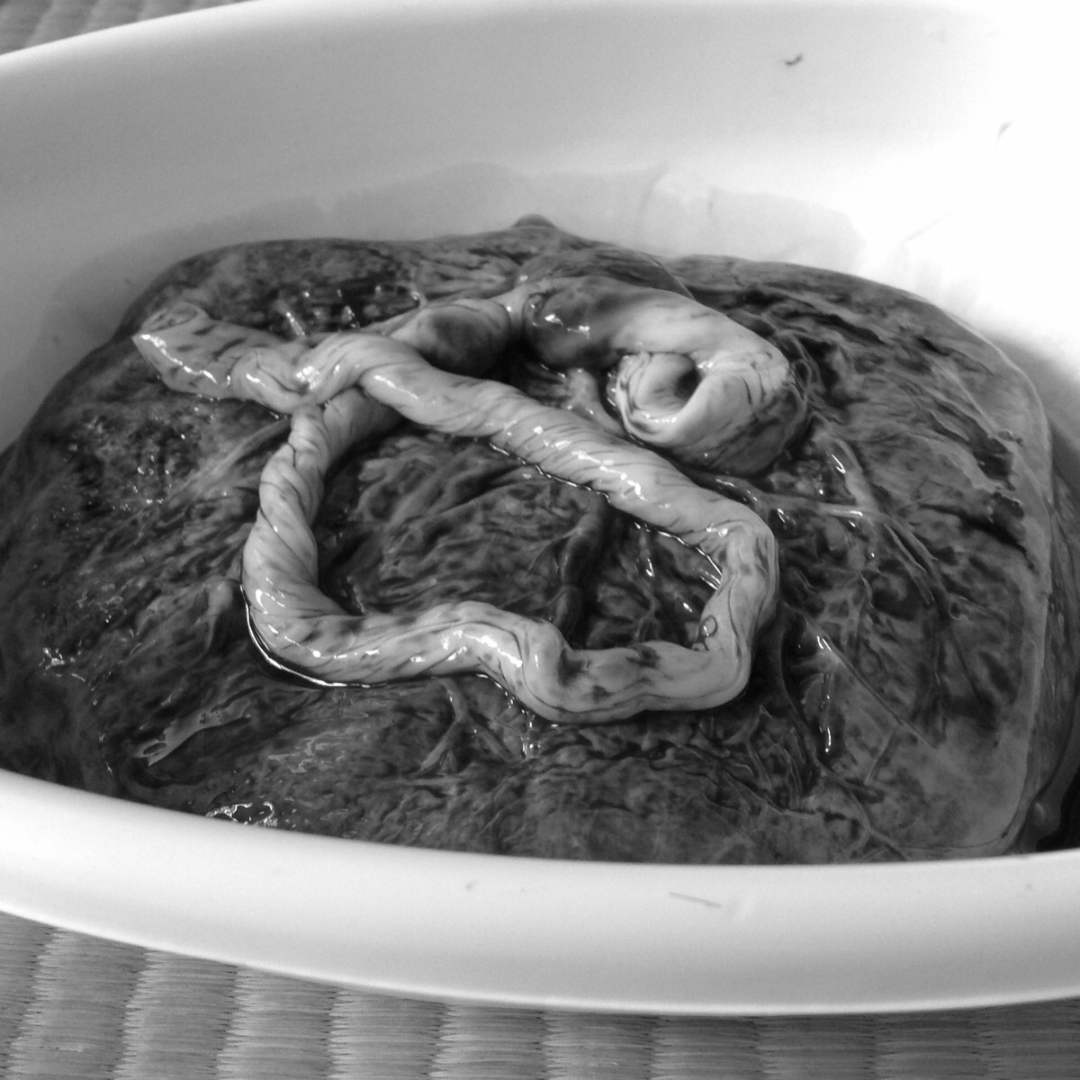 胎盤もドゥるんっとでてくる。前回もおもったけれど、すごい迫力があります。命を繋ぐ重大任務を終えた胎盤様。写真をあえてのせます。見たことない人多いから。白黒でね。平均500gで私のは600gくらいあった。おんくん大きく産まれたからね。