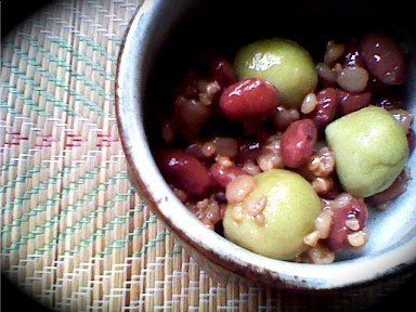今週のyoga082は 金時豆と麦とひえの黒糖煮にみどりもちの仲間入り